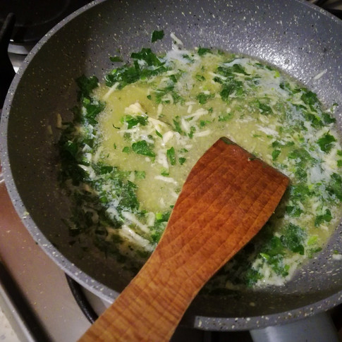Sos maślany do bułeczek jest bardzo prosty - na małej łyżeczce oliwy delikatnie podsmażam czosnek, zestawiam z ognia i dodaję posiekaną natkę pietruszki. Następnie dodaję zimne masło i mieszam aż się rozpuści, lekko solę. Takim sosikiem polewam połówki bułek, które przed samym podanie przypiekam w piekarniku - wystarczy 2 minuty na 200 st. C.